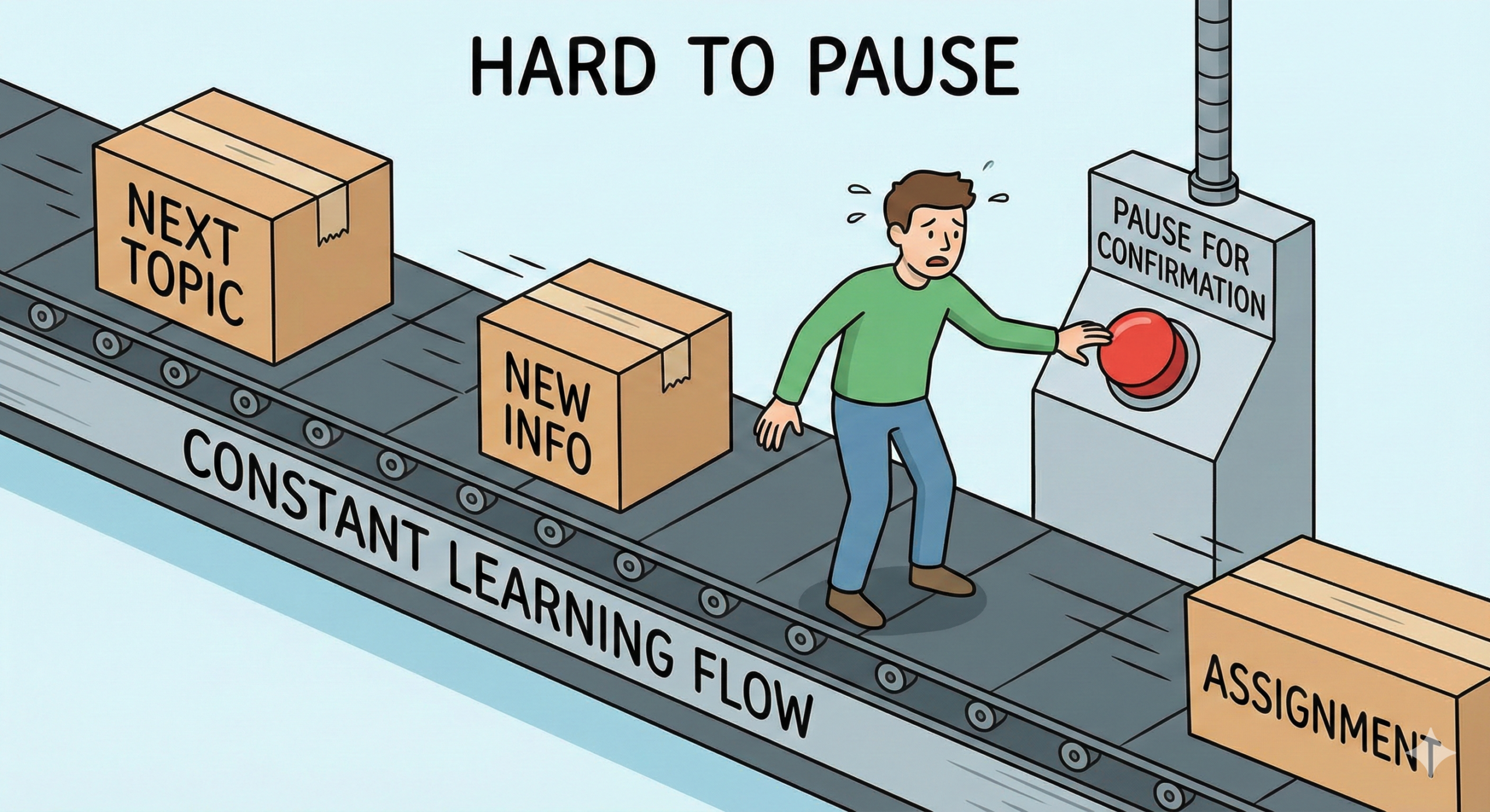 学習を続けていると、内容に違和感を覚えながらも、そのまま先へ進んでしまう流れに入り込むことがある。一度その流れができると、立ち止まって確認することが難しくなり、理解の浅さを自覚していても修正しづらくなる。この状態は個人の問題というより、学習の進行そのものが持つ性質によって生まれやすい。