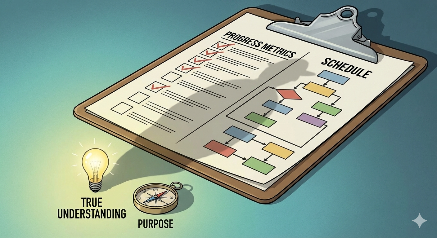 学習の中で扱いやすいのは、ページ数や完了率、学習時間といった数値で表せる指標である。これらは進捗を把握しやすく、努力を可視化する役割を持つ。一方で、理解の深さや納得感は数値化しにくいため、評価の対象から外れやすい。その結果、手段であるはずの指標が、いつの間にか学習の目的として扱われてしまう。