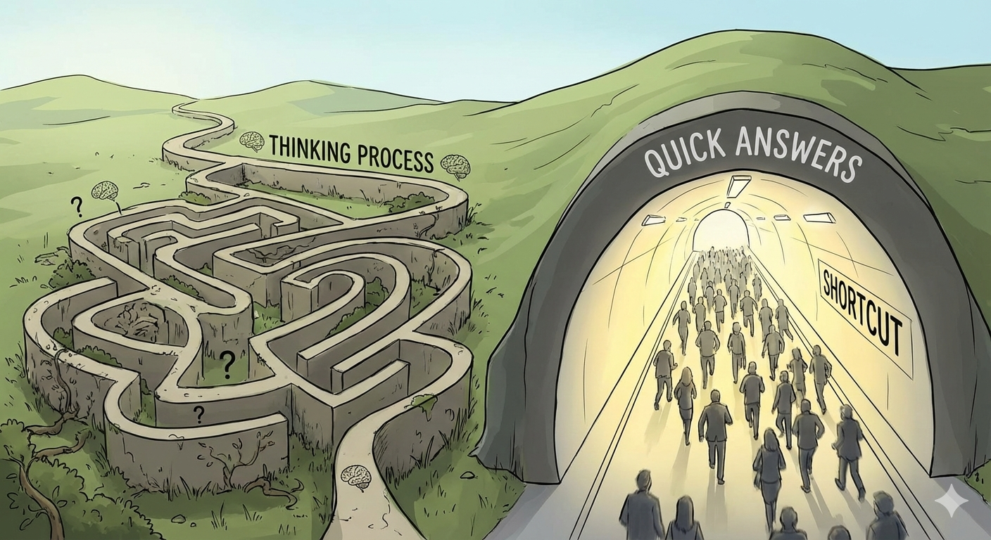 効率を重視する意識が強くなると、途中の思考過程よりも正解にたどり着くことが価値あるものとして扱われやすくなる。迷う時間や試行錯誤は無駄のように感じられ、最短ルートを選ぶ判断が繰り返される。その結果、考える余地は自然と削られ、学習は結果確認の作業に近づいていく。