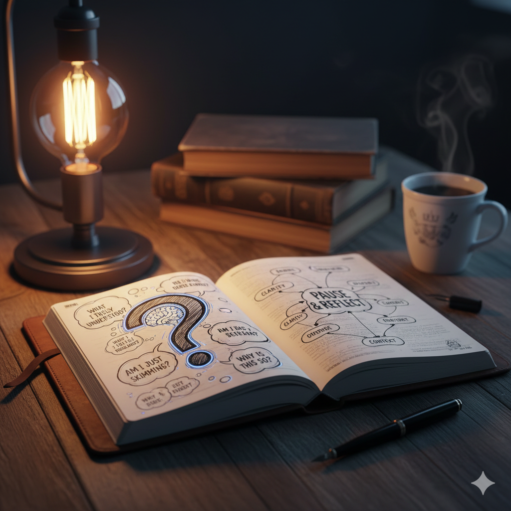 学習を進めていると、内容を追うこと自体が目的になり、気づかないうちに流してしまう場面が増えていく。その結果、理解が浅いまま先へ進んでしまい、後から振り返ったときに手応えのなさを感じやすくなる。こうした状態を防ぐためには、学習中に意図的に立ち止まるきっかけを作ることが重要になる。その役割を果たすのが、自分に向けた問いである。